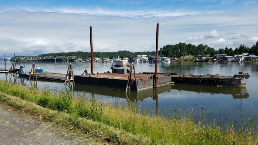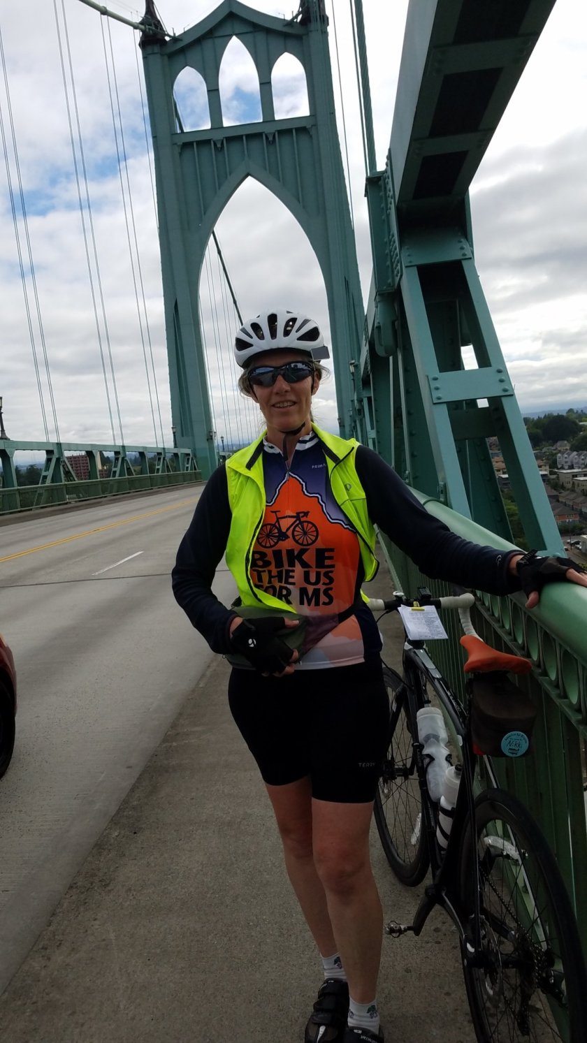 We crossed the St. Johns Bridge today. One lane was for cyclists but I stopped and got on the sidewalk so I could take photos. Then Dirk came by and offered to take my photo. Nice! While standing on the sidewalk, one could feel the vibration of the bridge. It was a little disconcerting. Had to tell myself it wouldn’t collapse to close down the panicky feeling.