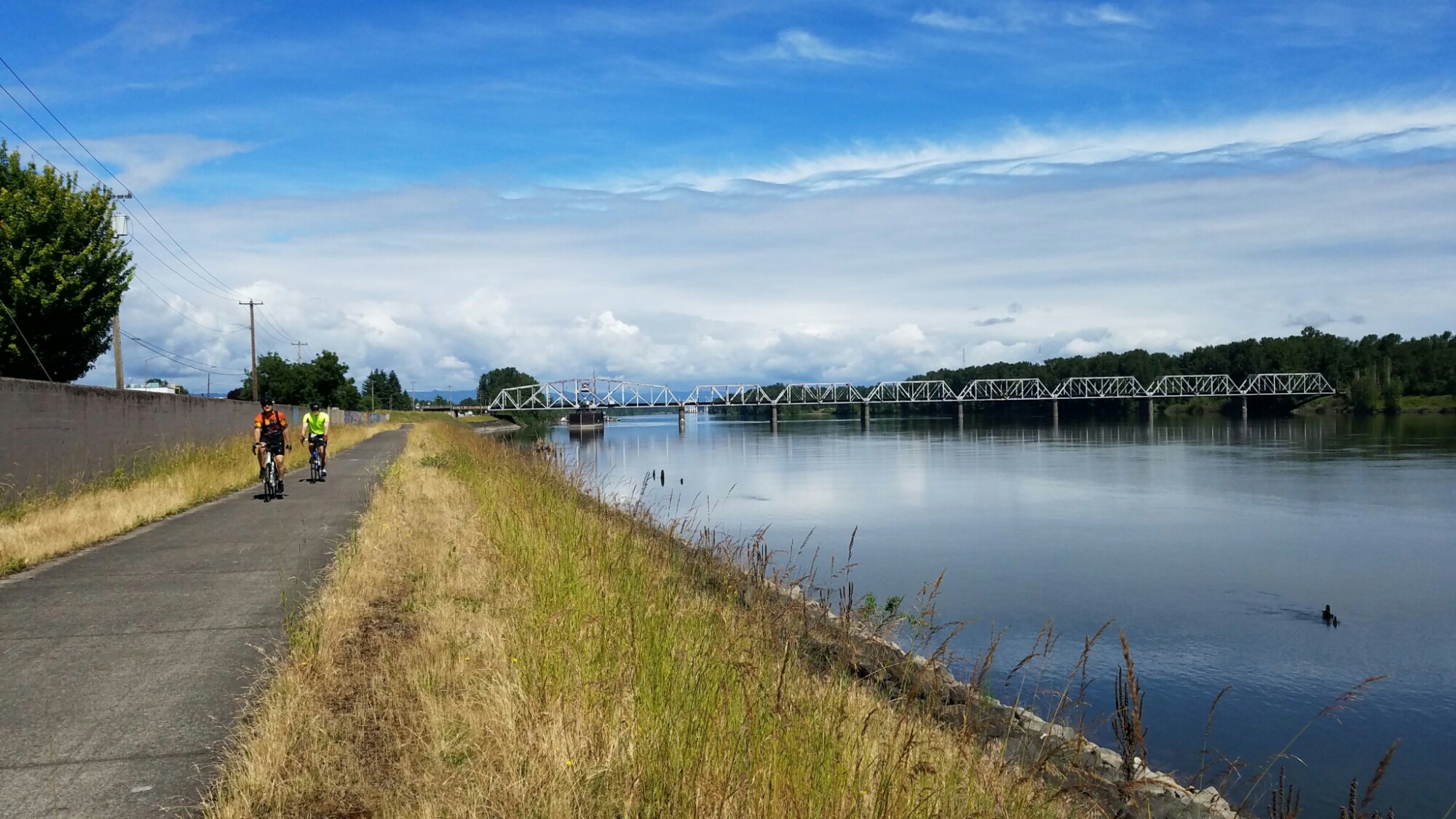 We crossed the St. Johns Bridge today. One lane was for cyclists but I stopped and got on the sidewalk so I could take photos. Then Dirk came by and offered to take my photo. Nice! While standing on the sidewalk, one could feel the vibration of the bridge. It was a little disconcerting. Had to tell myself it wouldn’t collapse to close down the panicky feeling.