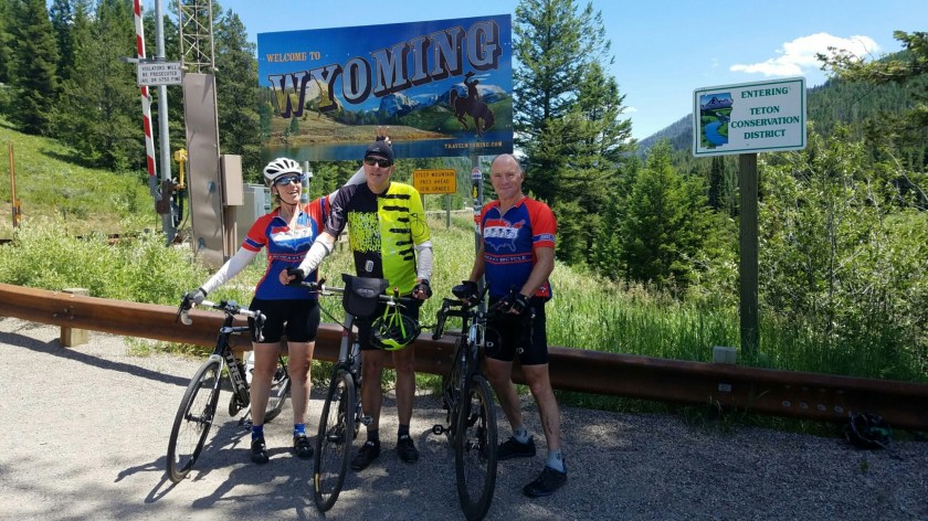 And we made it to Wyoming at mile 71. Here I am with Roel and Dirk. Roel didn’t know what I was up to but he did tell me to stop touching his hair.