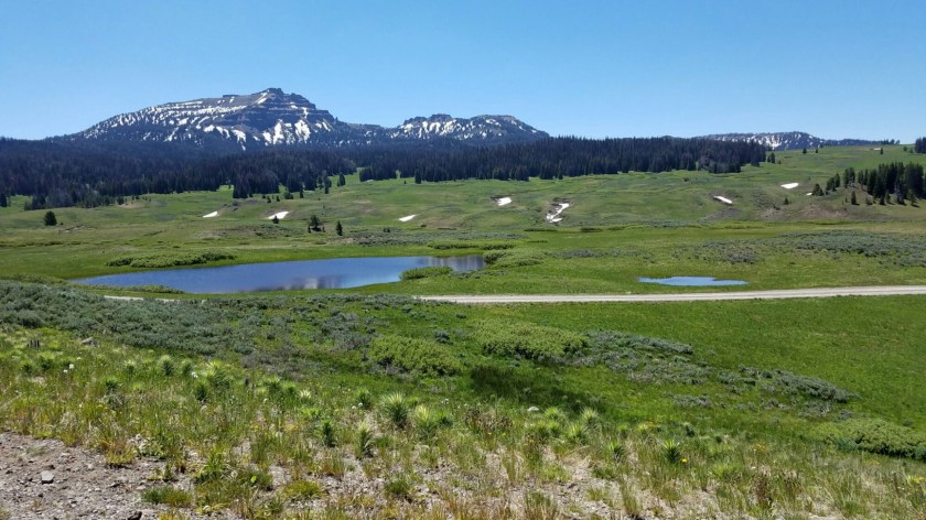 Just beyond this point, I crossed the Togwotee (TOE-go-tee) Pass at 9,658′ elevation. Togwotee was a Shoshone who guided the Army Corp of Engineers in the 1890s as they were looking for a way to create roads through the area.