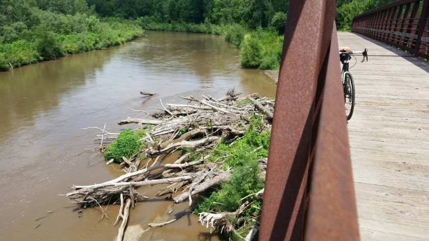 Arrived in town of Rushford and noticed a sign at the bank advertising the Root River Bike Path. I thought its too bad we didn’t have time to check it out. Well, it turns out that is exactly the path we went on. It was nice and would’ve been nicer if there hadn’t been that storm last night which knocked down leaves, limbs and branches. It also left muddy spots and puddles. Had to wash the bike again tonight and will probably have to do it again tomorrow as rain is predicted.
