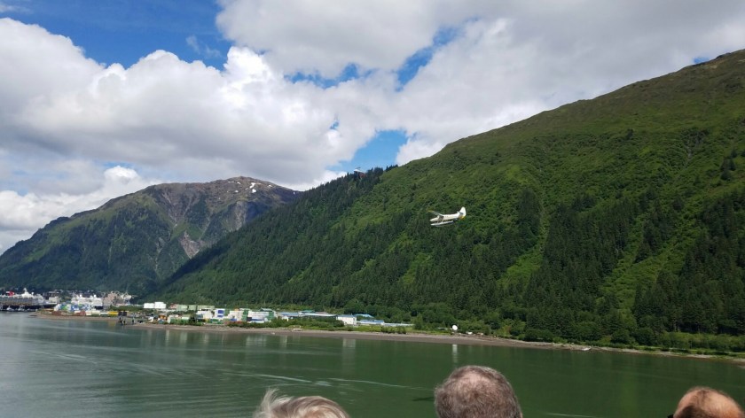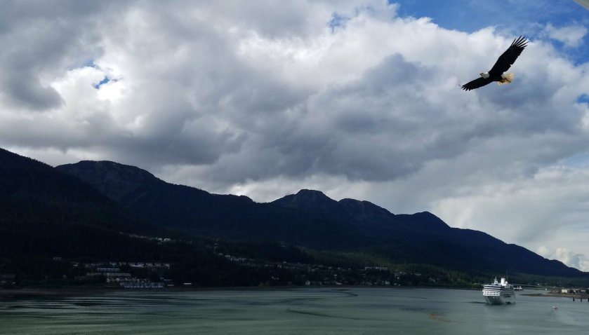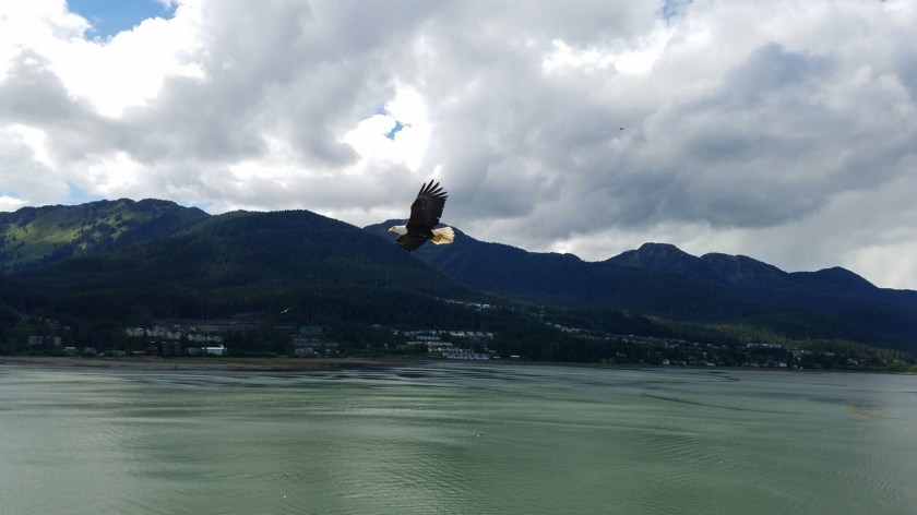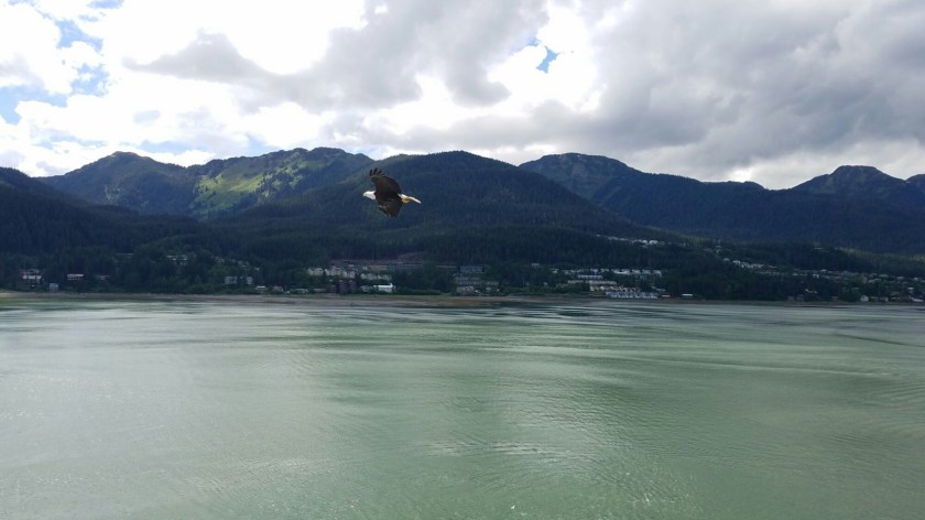 As we arrived in Juneau, there were many, many bald eagles in the area. It seems the ship disturbs the marine life which brings the birds to feed. There were also seagulls. Great to see the eagle dive, grab food and then fly off.